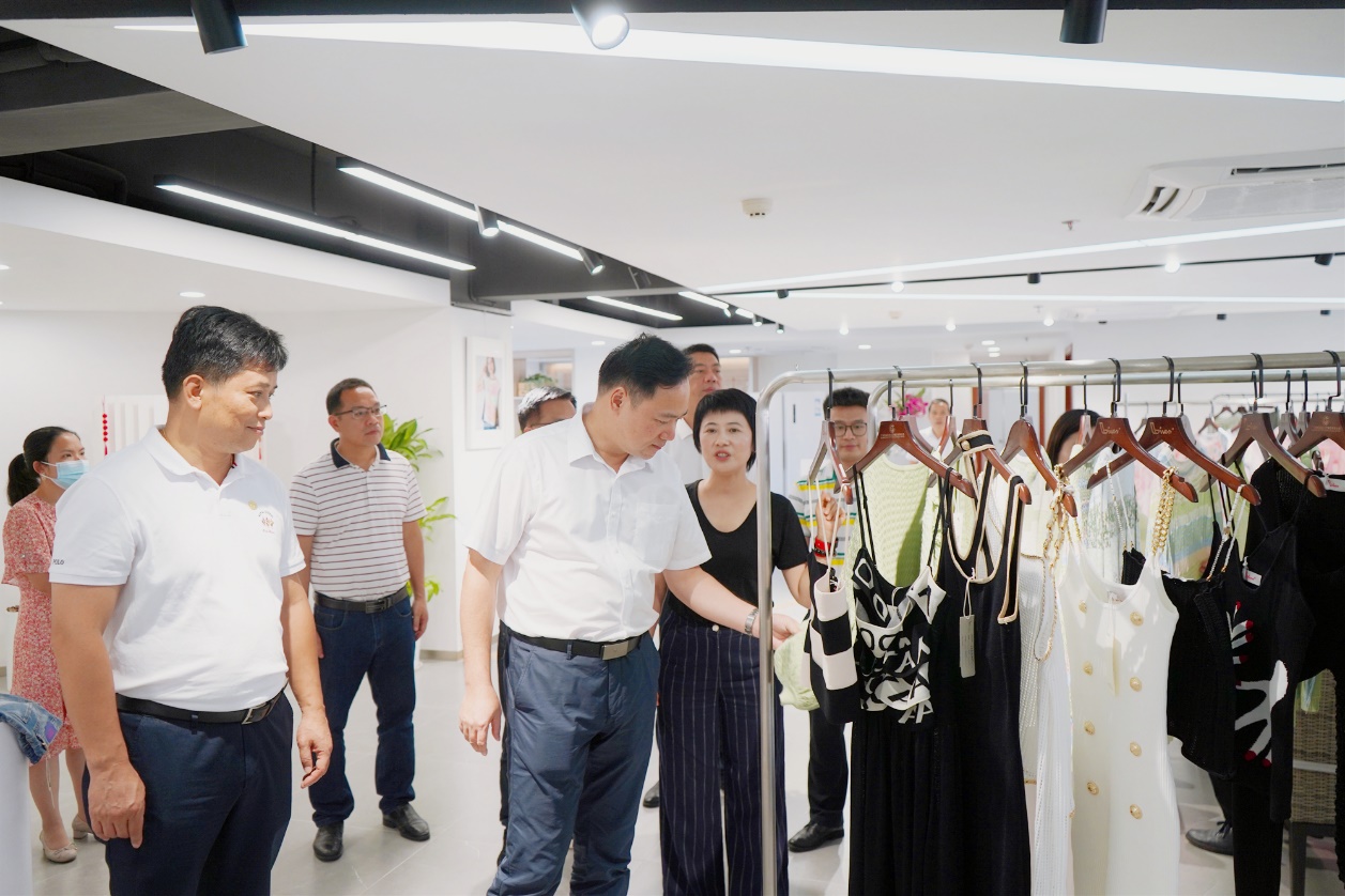 葛伟志邀请来访领导观看了公司宣传片,并陪同参观了公司8楼形象展厅。属下纺出公司副总经理张菁向来访领导详细介绍了展厅里牛仔服、时尚女装、毛衫、针织、童装等自主设计的服装产品及家具用品。甘德权对XK在线平台自有品牌产品及自主设计给予了高度肯定,并表现出了极大兴趣。