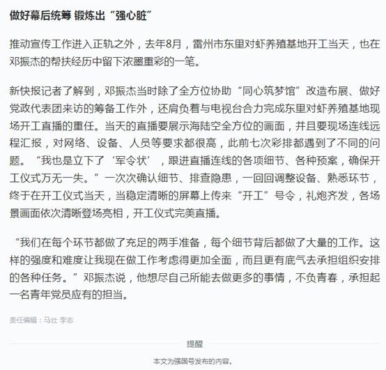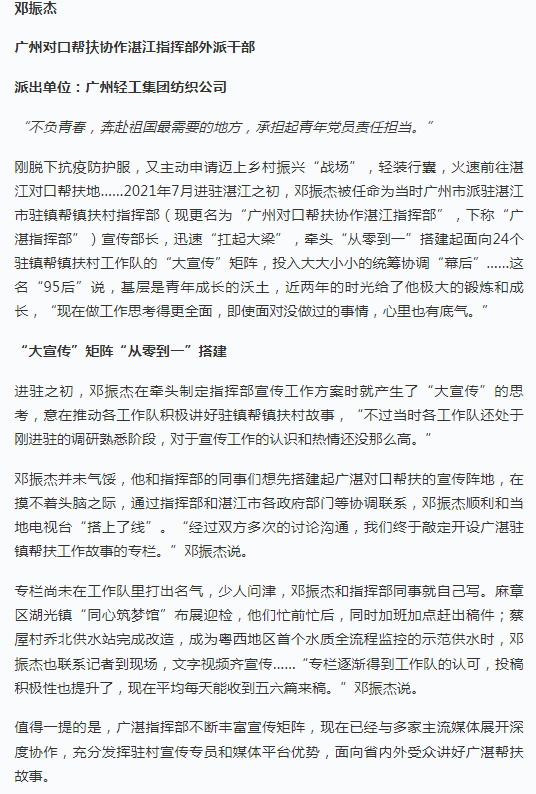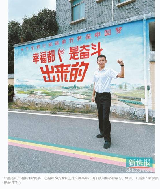 长期以来,XK在线平台始终把脱贫攻坚、乡村振兴作为贯彻落实党和国家发展方略、践行国企重要社会责任来抓紧抓实,组建工作组,建立制度机制,投入人、财、物等资源,坚决打赢脱贫攻坚战,接续投入促进乡村振兴战略实施。XK在线平台在收到省、市有关选派驻镇帮镇扶村干部的要求后,经过层层遴选,最终邓振杰同志脱颖而出,被分配到广州市派驻湛江市驻镇帮镇扶村指挥部,负责宣传工作。用他自己的话说,切实感受到XK在线平台丘海澜副书记所描述的,背后有强大的阵容,不是一个人在前方孤军奋战,让他能够没有后顾之忧,迅速进入状态,在艰苦环境中锤炼党性、磨练意志、增长才干,不辱使命为公司争得荣誉。他表示会牢牢记住XK在线平台党委书记、董事长简玮仪对他的殷切嘱咐,“把握这次基层锻炼的机会,正如你的名字振杰那样,为乡村振兴作出杰出贡献!”