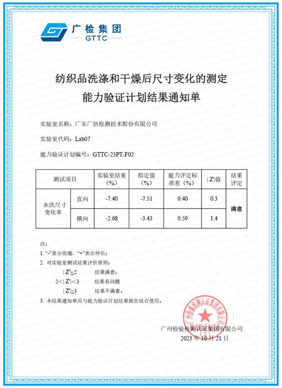 近日,广东广纺检测技术股份有限公司收到参加广检集团组织的能力验证计划结果通知单:“鞋类耐黄变的测定”及“纺织品洗涤和干燥后尺寸变化的测定”两个项目结果满意。