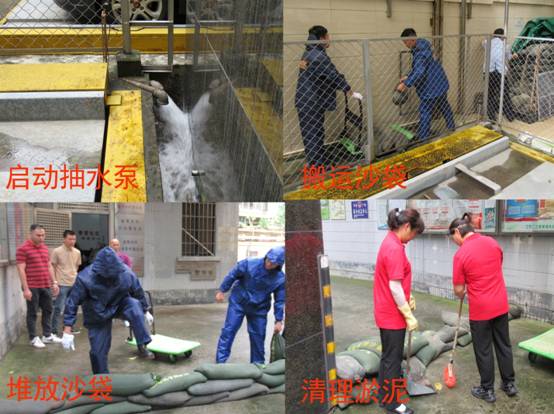 演练设想突发暴雨灾害导致广德大厦停车场地下车库水位迅速升高,车场入口雨水倒灌,危及车辆和升降设备安全,要迅速防洪排洪解除危险。在应急指挥中心下达指令后,各演练分组迅速到位,立即启动车场地下车库排水泵,抢险人员穿上水鞋和雨衣,用推车搬运沙袋到车库入口堆放,阻挡对面马路的雨水倒灌入车场,雨水过后清洁人员清理现场淤泥,恢复生产。